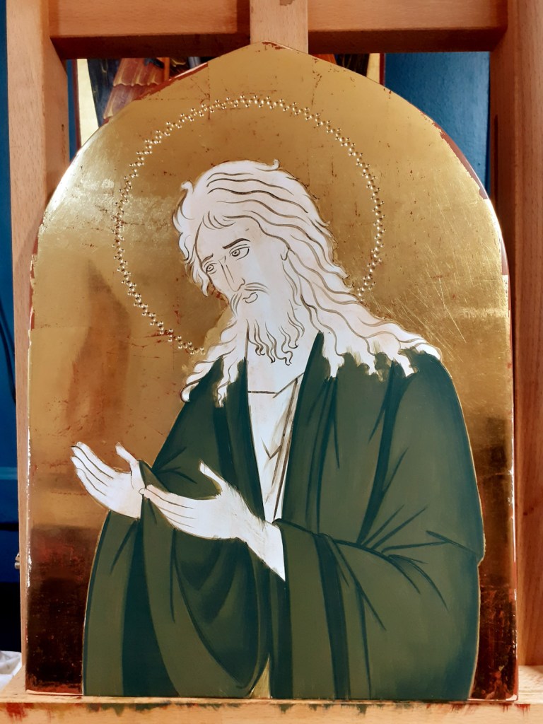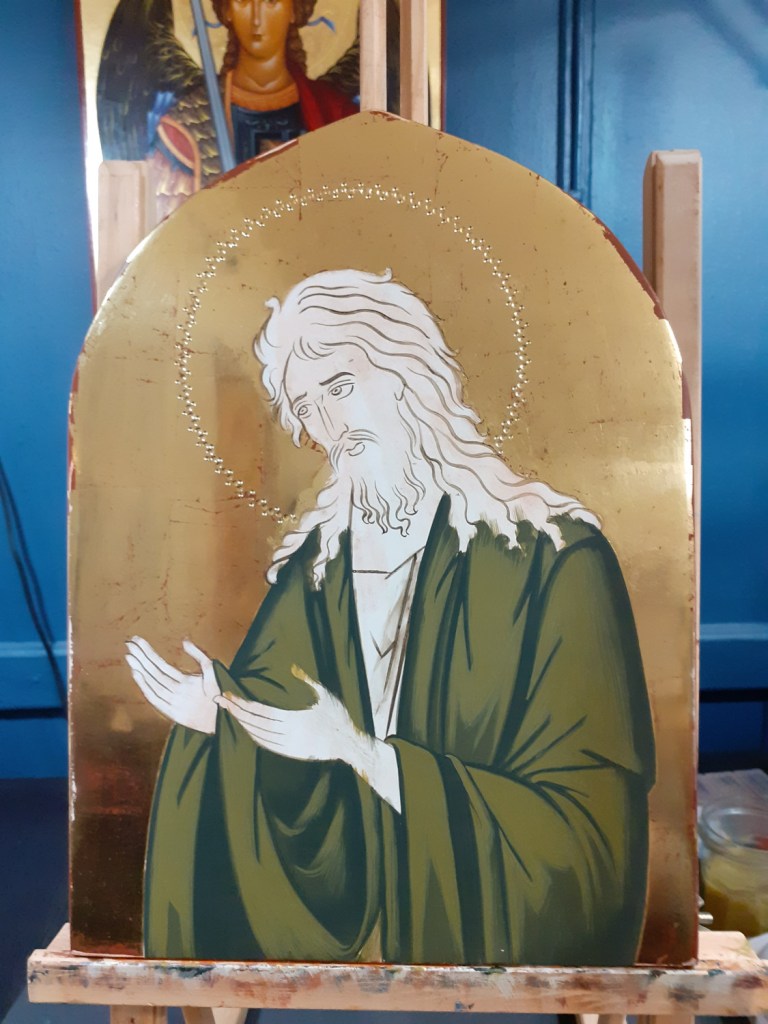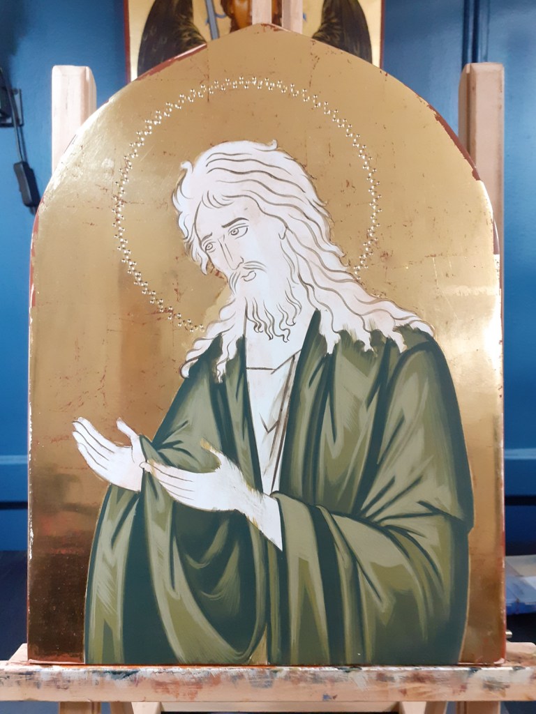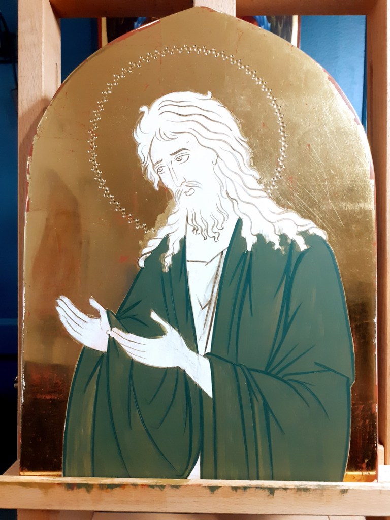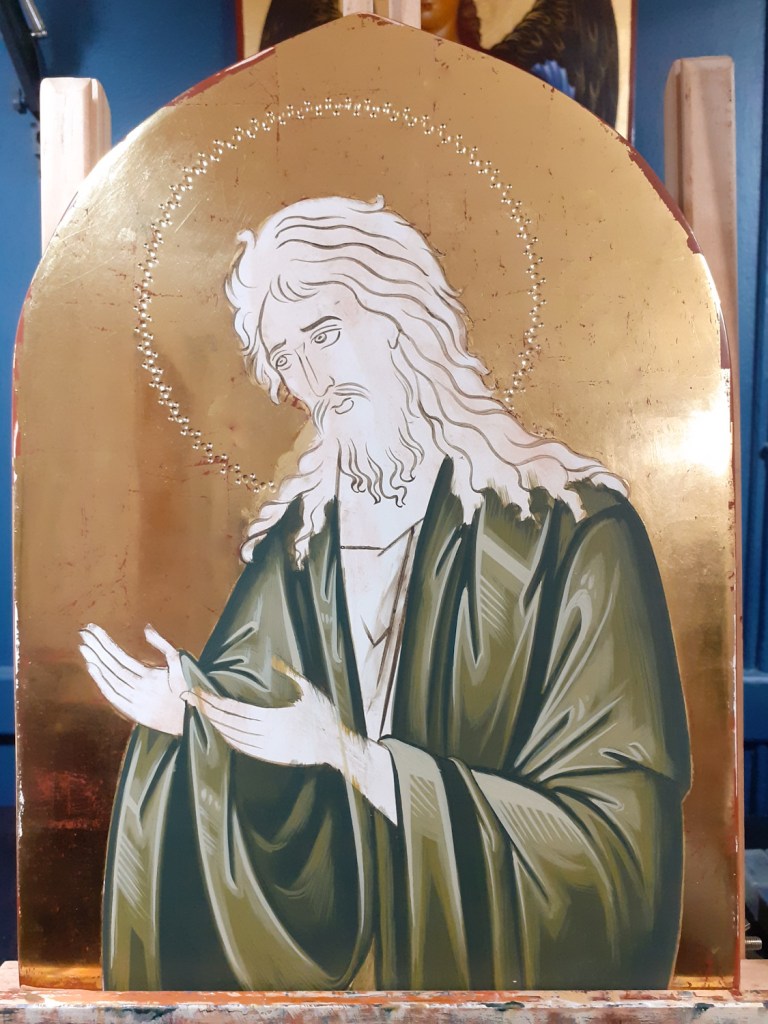 To create green you don’t actually need green! Here, the green garment is painted mixing Ultramarine blue, Golden ochre and Titanium white.
