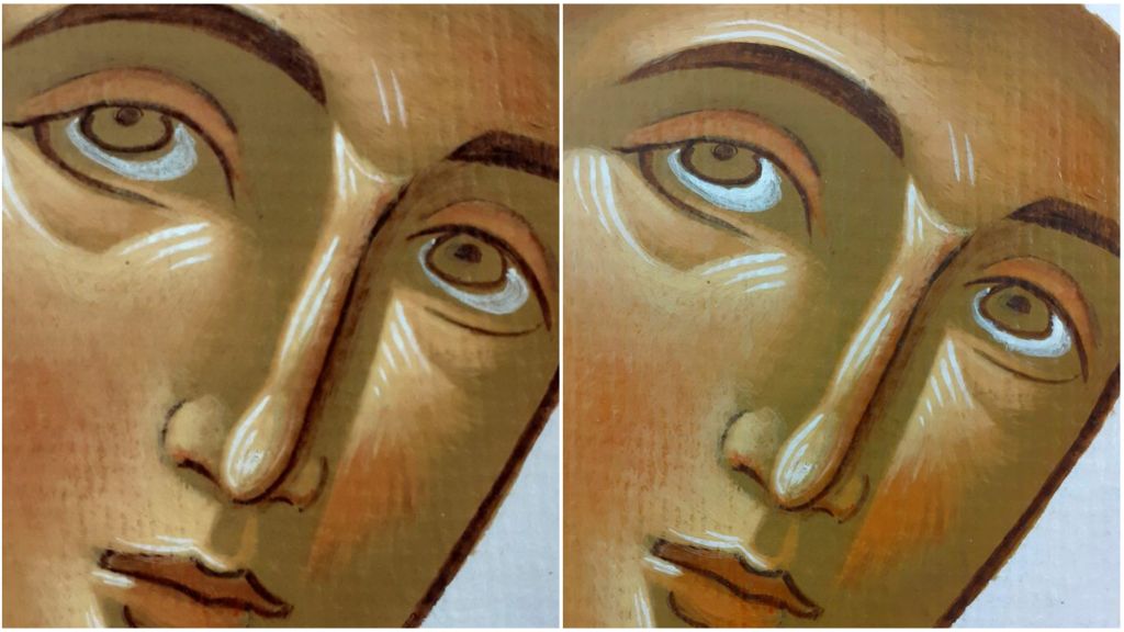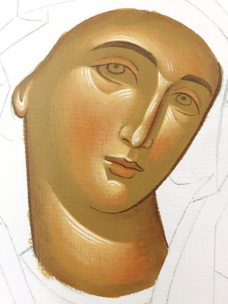 Pyrrodismos = Warm tones (blush)=glaze: cinnabar very diluted. We add with very light strikes, (almost dry-brushing) the warm tone on the chicks, upper lids, along the nose’s graphic line, lips, ear lobes, forehead’s, chin’s and neck’s narrow sides. It is essential to let dry between each layer. If it seems too red, glaze it with very diluted 1st light to tone it down.