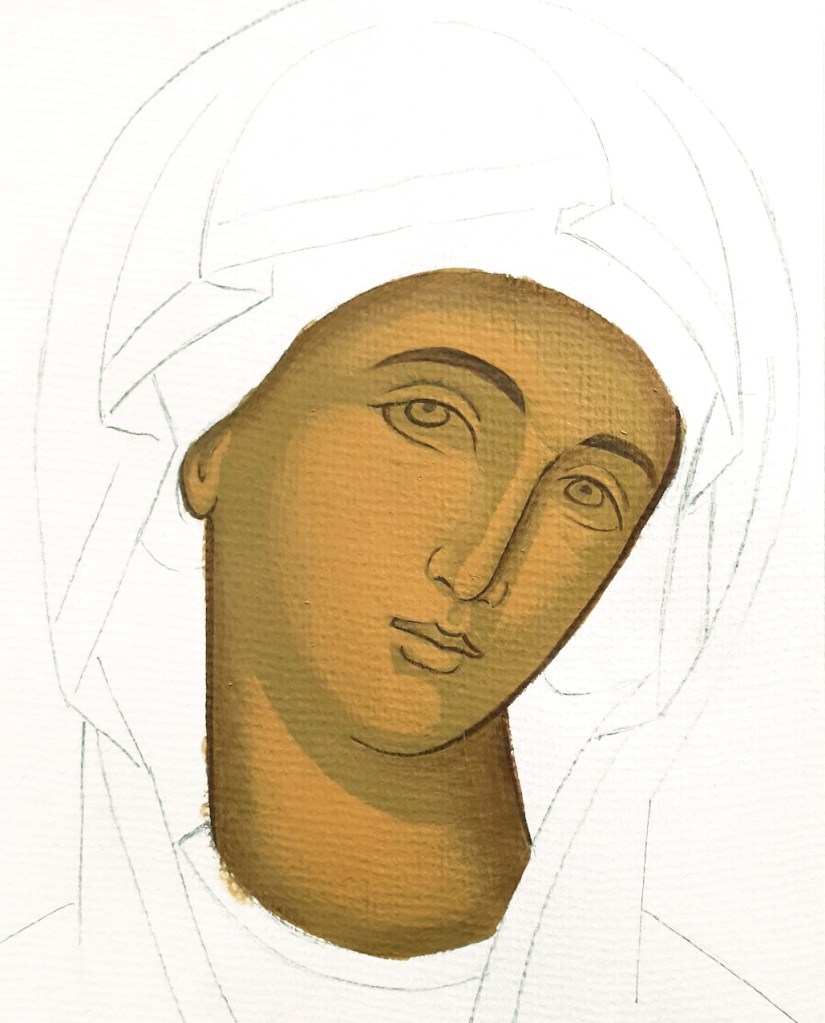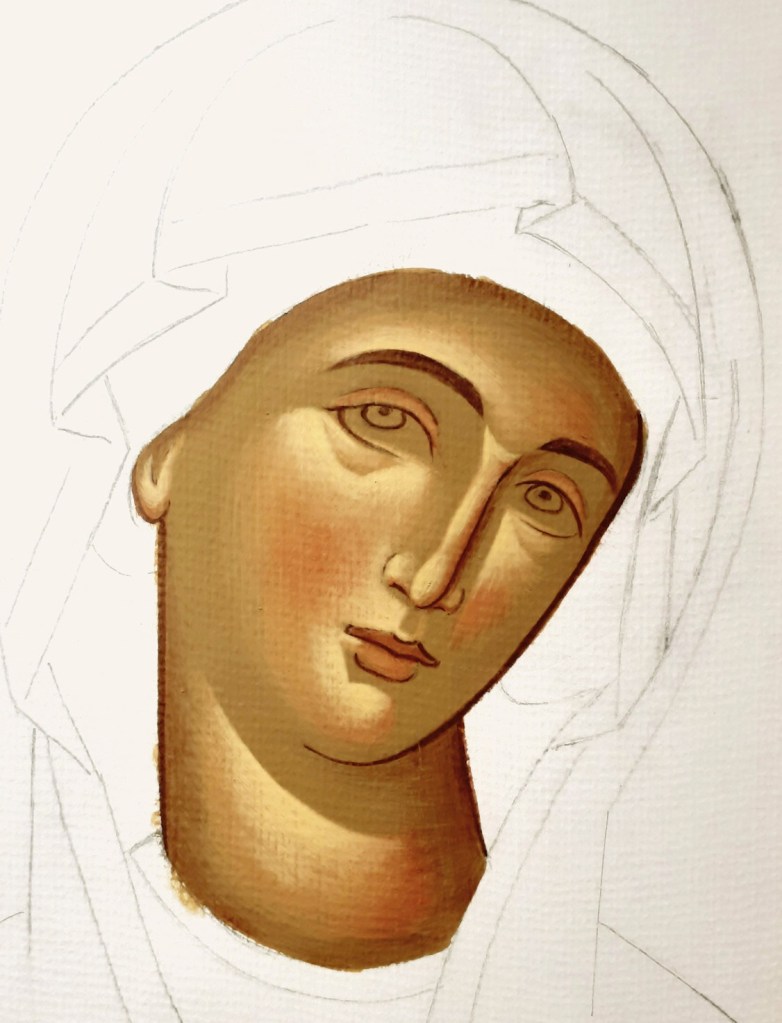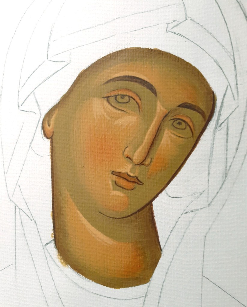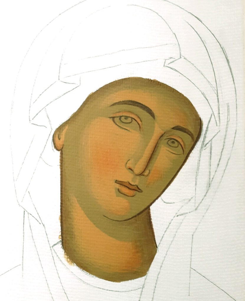 …και συνεχίζουμε δουλεύοντας με λεπτές στρώσεις που αφήνουμε να στεγνώνουν πριν συνεχίσουμε. Επεκτείνουμε σιγά σιγά τις πινελιές μας, χτίζοντας σταδιακά τα σχήματα του οβάλ του προσώπου, και των χαρακτηριστικών όπως φαίνονται στην παραπάνω εικόνα. Αφήνουμε να φαίνεται ο προπλασμός γύρω γύρω και σε συγκεκριμένα σημεία. Ο προπλασμός ως σκουρότερο και ψυχρότερο χρώμα σε σχέση με το πιο ανοιχτό και θερμό φώτισμα, λειτουργεί ως σκιά, προβάλλοντας τα φωτισμένα σημεία και έτσι δημιουργείται η αίσθηση του όγκου.