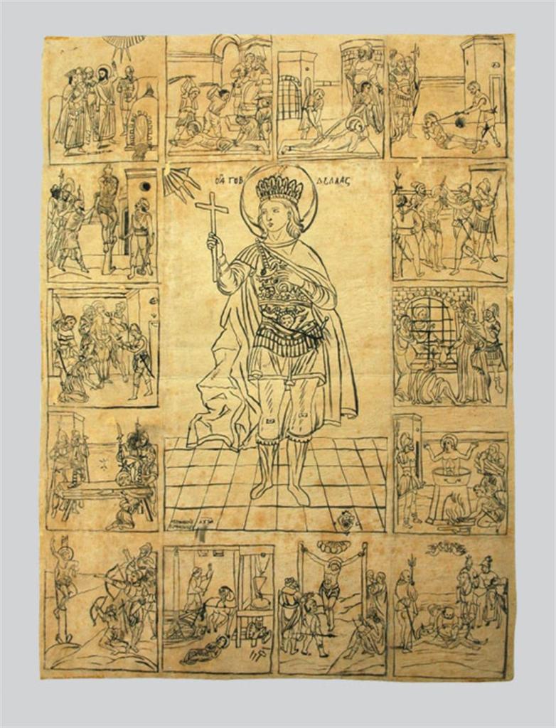 I don’t think there is an exact translation for the word “ανθίβολον”. The term is used to determine every drawing the painter creates in order to transfer and reproduce an icon. Anthivola (plural of anthivolo) were vastly used in post-Byzantine times, initially in Crete and the Venetian-occupied areas as the demand of icons through the christian territories rose. Once created the anthivolon could be used several times to reproduce the same image so it was kept and preserved with caution due to the fragile nature of the paper. They were concidered among the painters as one of the most important and valuable tools and were passed on either by inheritance, sale or exchange.