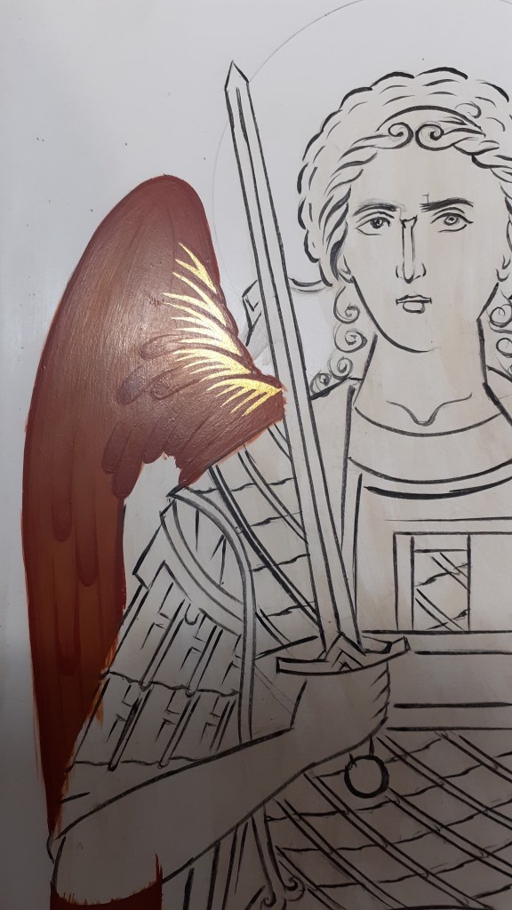 Step 3: Golden lines = Powder gold or golden ochre+a granule of titanium white. To achive precise lines try using a liner brush. I used a kolinsky liner Raphael no 2 and powder gold. Make it rather thin and stir every time you dip your brush because the powder sits at the bottom and you and up drawing with plain egg. Don’t pass more than one layer to make it more solid. Once is enouph to make it shine. You can also use shell gold but that is another tutorial.