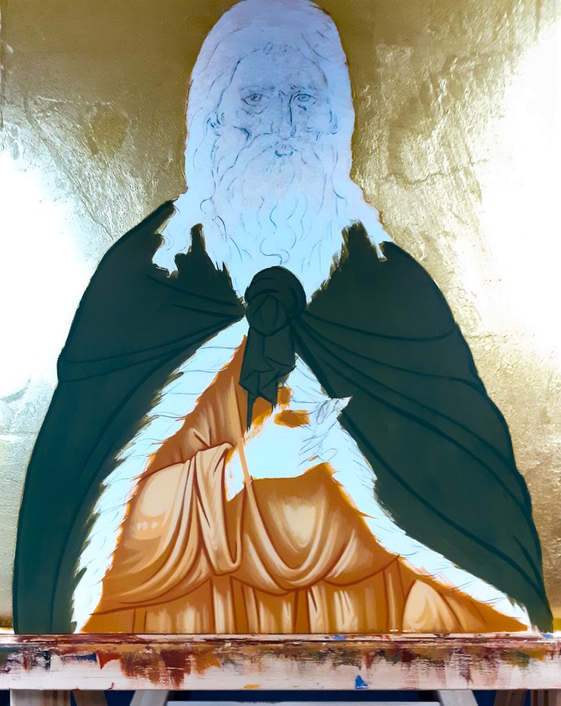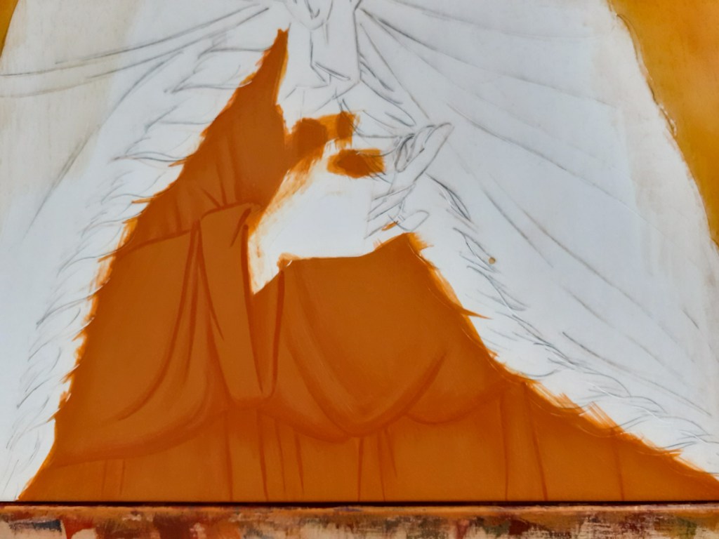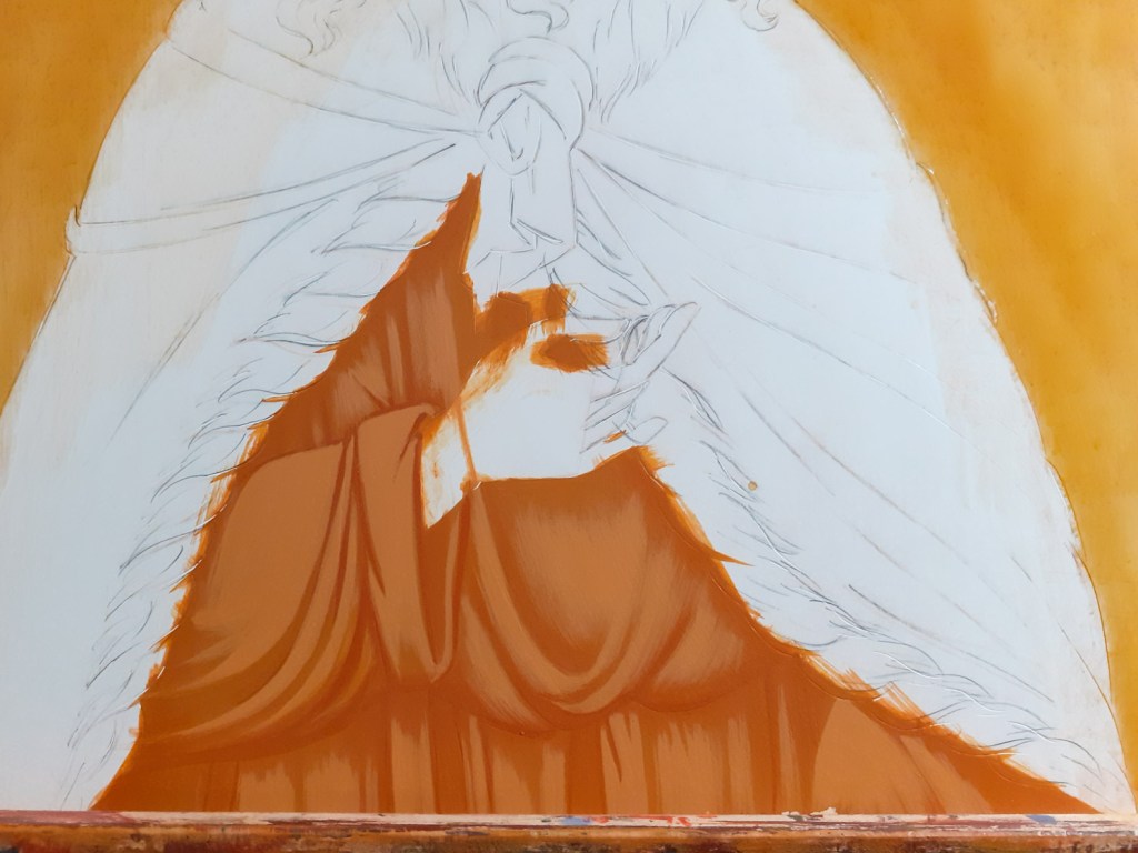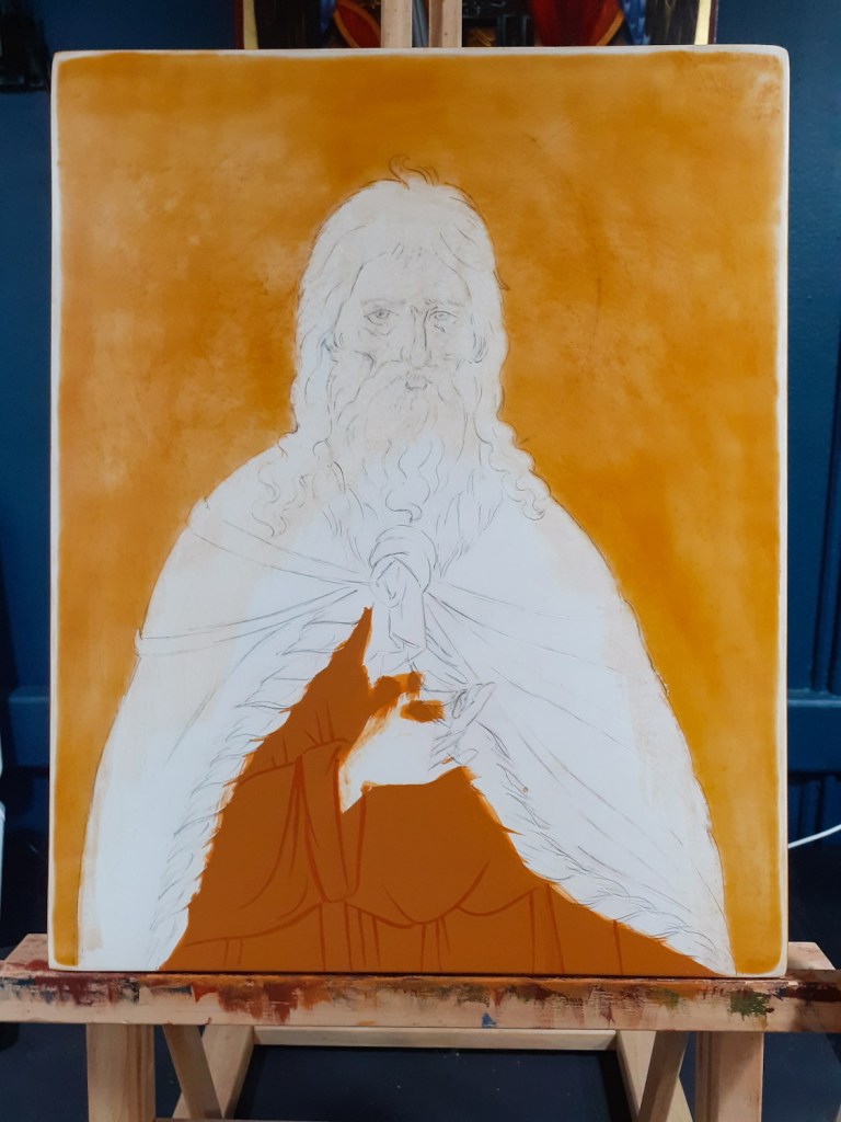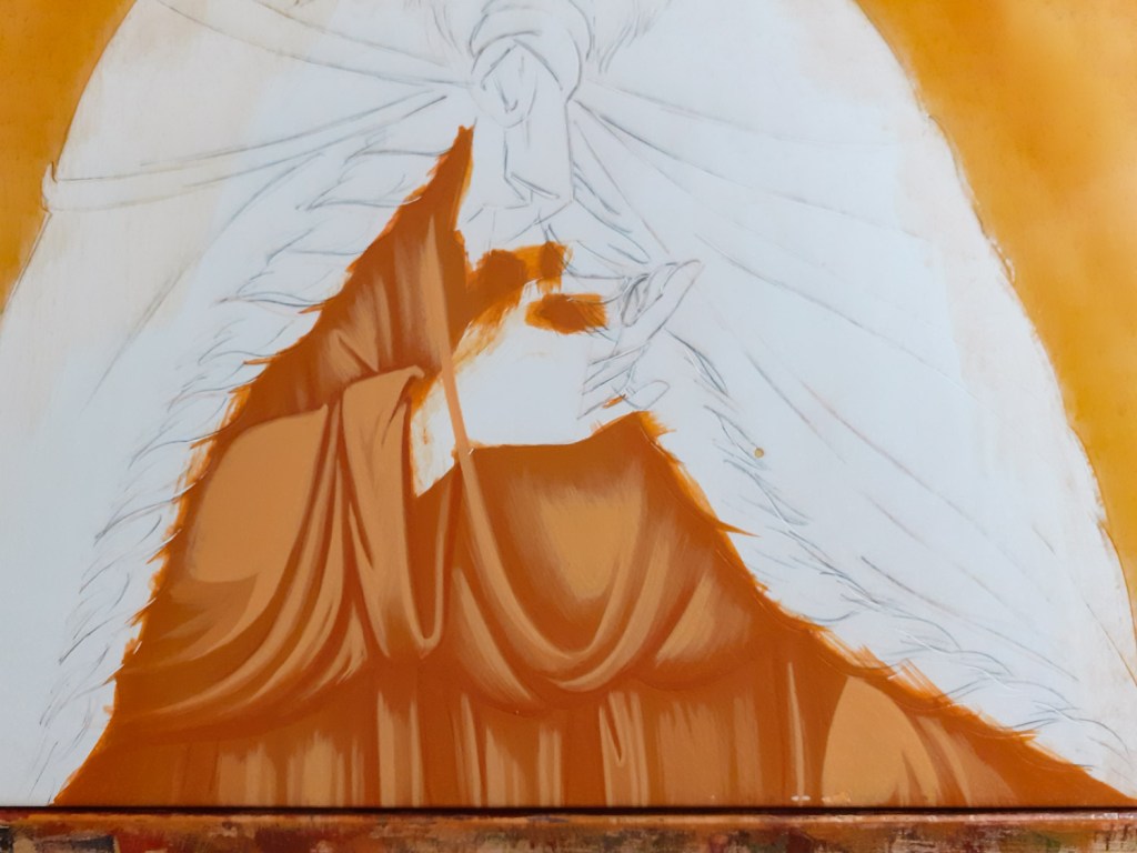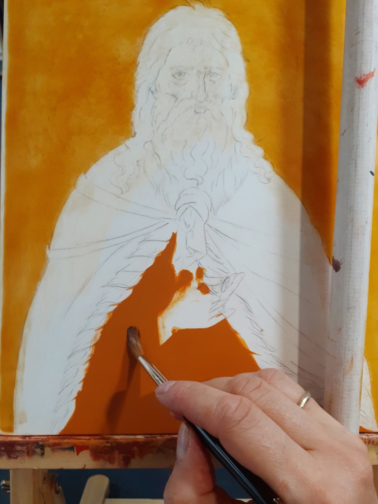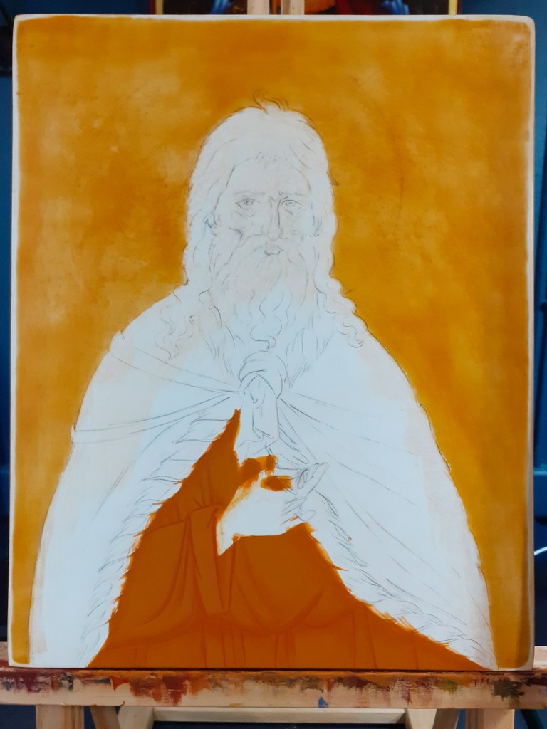 In today’s lesson we will paint together the orange clothing of prophet Elijah (prophet Elias). The pigments we are going to use are: Golden ochre, Cinnabar, Iron oxide red (or venetian red) and Titanium white).
