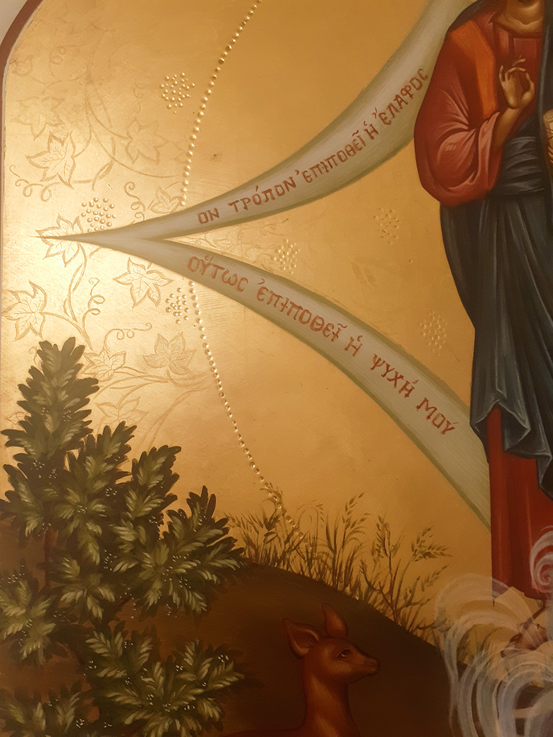 Ὅν τρόπον ἐπιποθεῖ ἡ ἔλαφος ἐπὶ τὰς πηγὰς τῶν ὑδάτων, οὕτως ἐπιποθεῖ ἡ ψυχή μου πρός σέ, ὁ Θεός.