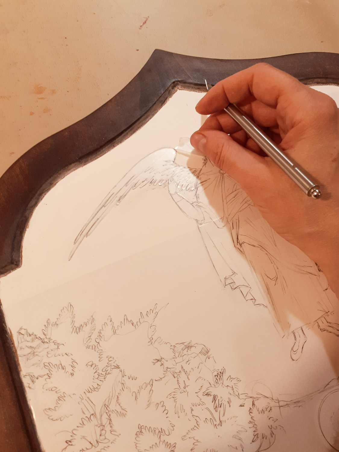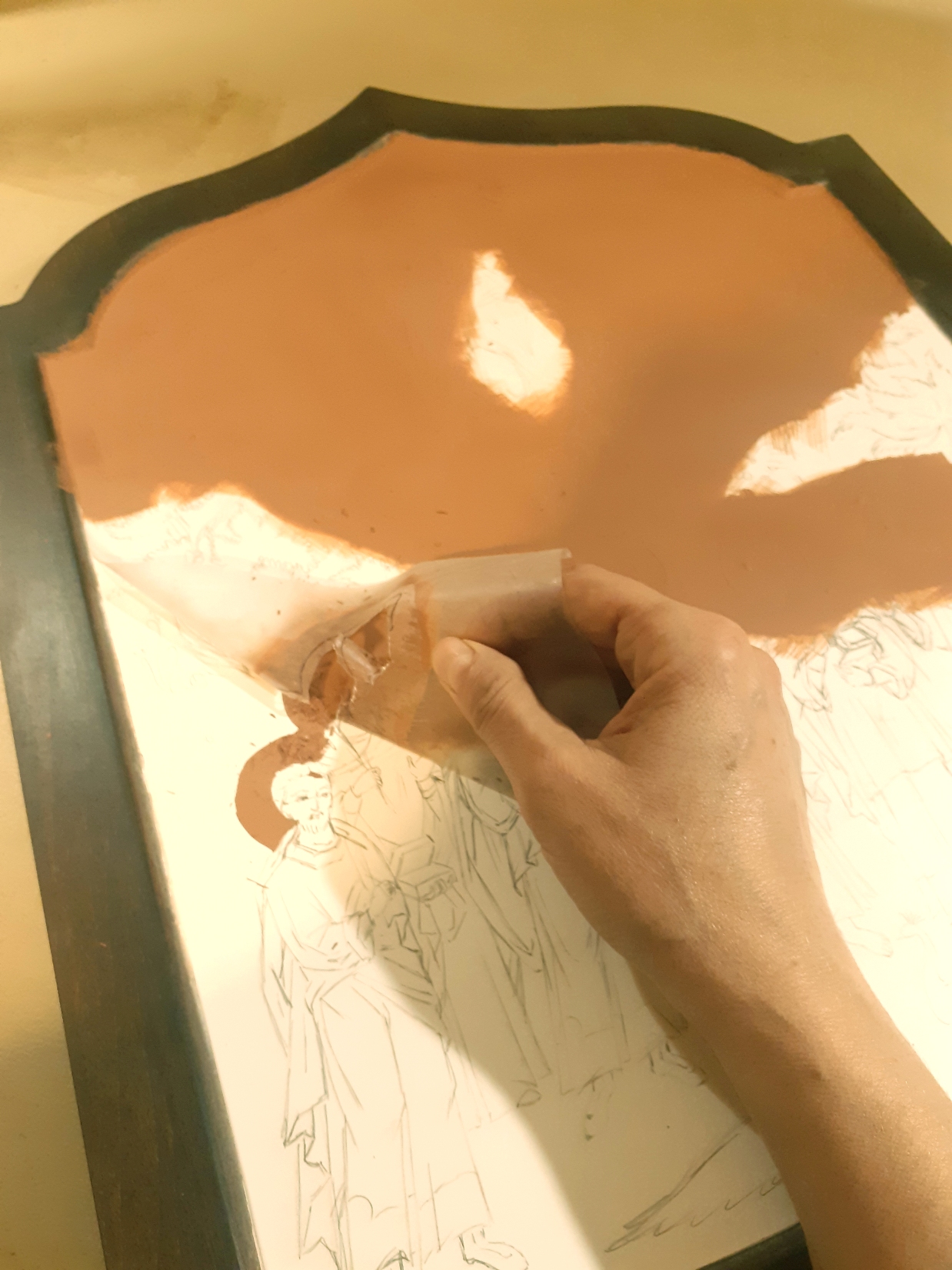Με ένα πολύ κοφτερό και μυτερό νυστέρι, έκοψα πολύ προσεκτικά τη μάσκα και αφαίρεσα ότι χρειαζόταν ώστε να μείνει ακάλυπτη μόνο η επιφάνεια που επρόκειτο να χρυσωθεί.