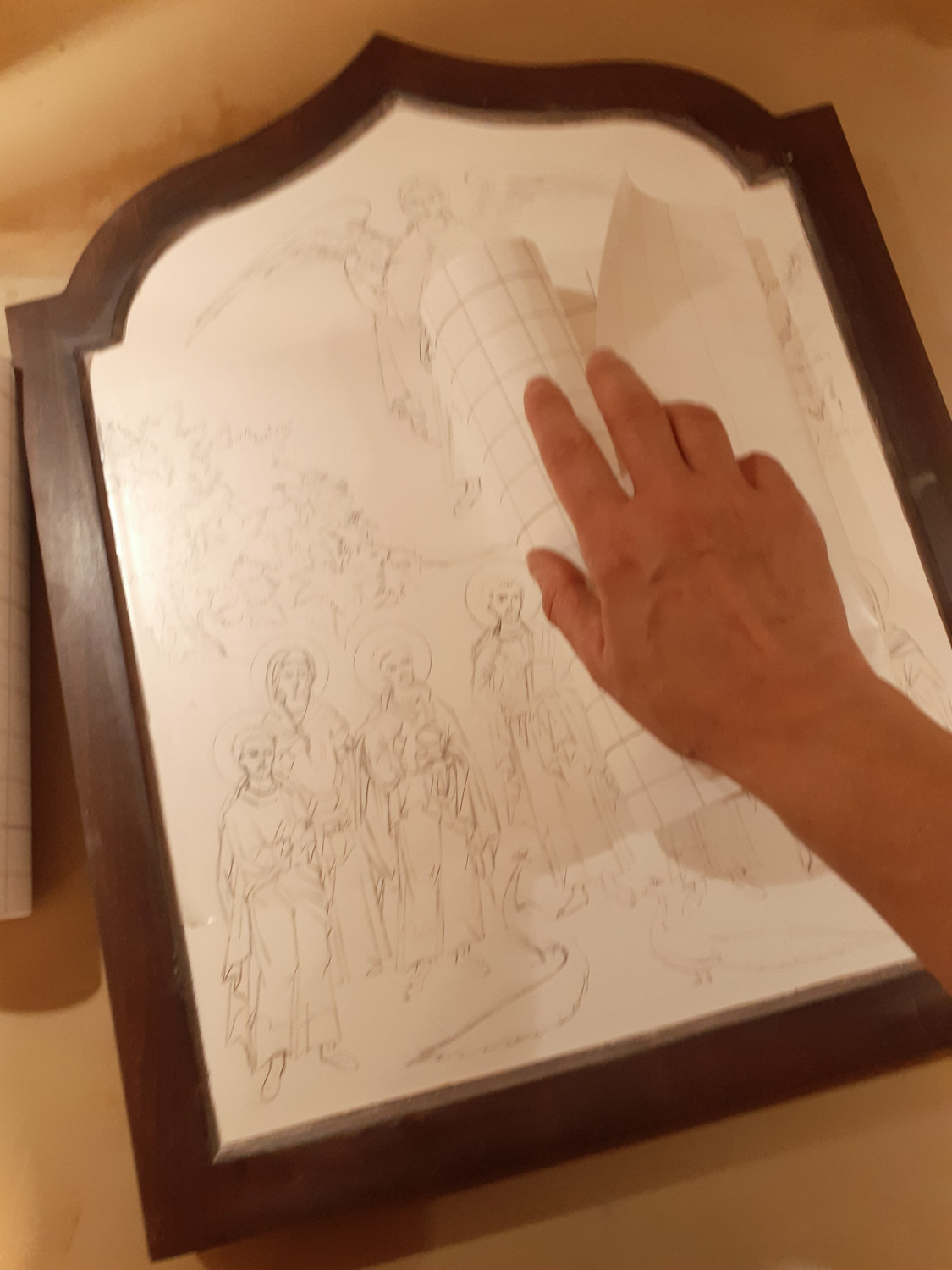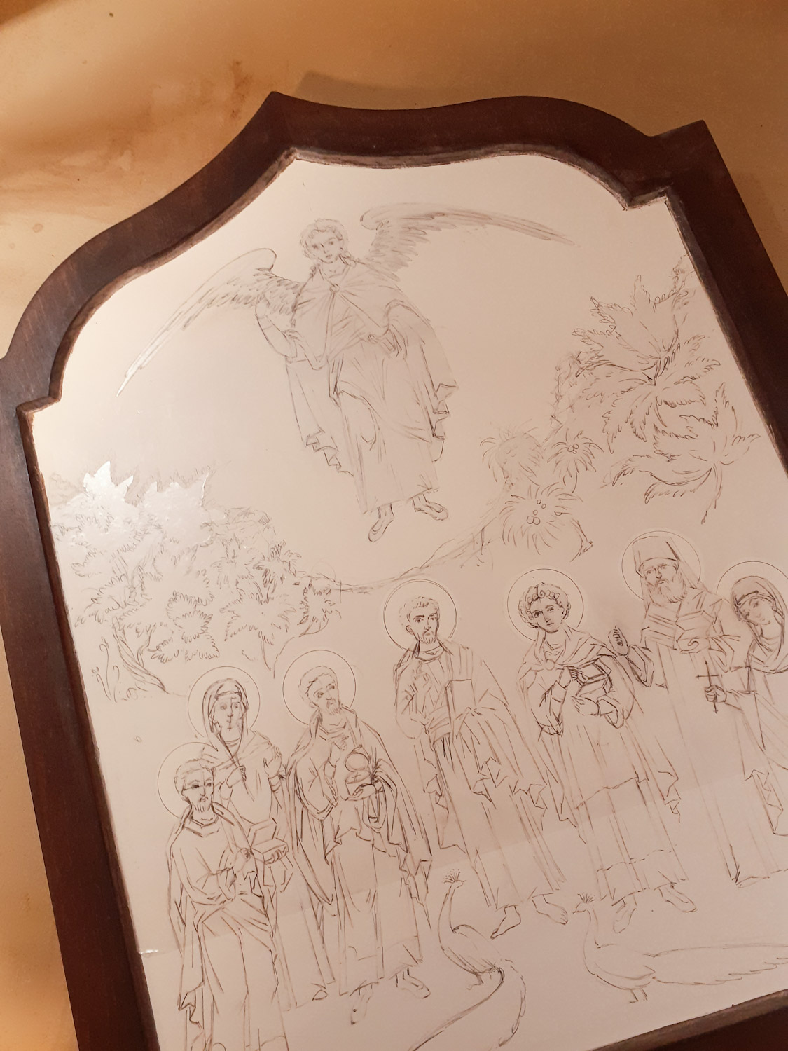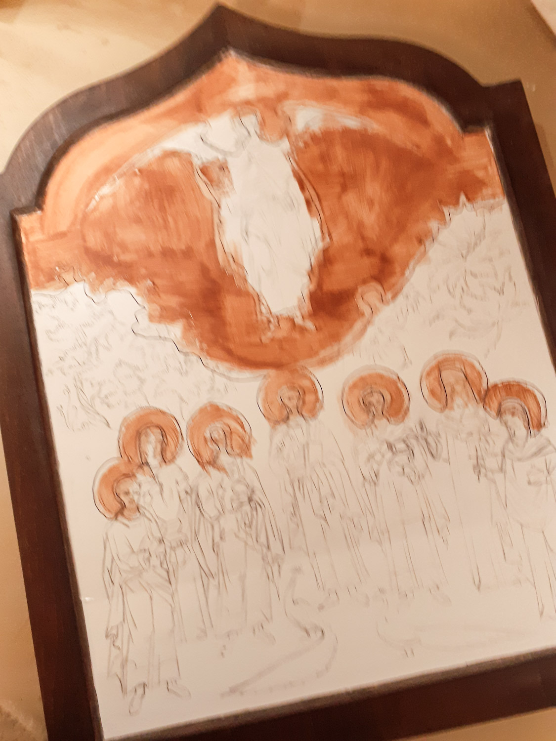 Εδώ φαίνεται το 1ο και το τελευταίο χέρι αμπόλης. Πέρασα συνολικά 35 λεπτές στρώσεις και έχω πετύχει ένα πυκνό, ομοιόμορφο, λείο και ελαστικό υπόστρωμα που είναι απαραίτητο για να δημιουργήσω τα ανάγλυφα σχέδια στο χρυσό. Κάθε στρώση πρέπει να στεγνώσει καλά πριν περάσω την επόμενη αλλά δεν πρέπει να επιταχύνω τη διαδικασία χρησιμοποιώντας θερμότητα γιατί κινδυνεύει να σκάσει και να δημιουργηθούν ρωγμές που θα είναι ορατές στη χρυσή επιφάνεια. Έτσι δουλεύω με υπομονή και αυτή η εργασία χρειάζεται μια ολόκληρη μέρα ξεκινώντας από νωρίς το πρωί και δουλεύοντας μέχρι αργά το βράδυ.