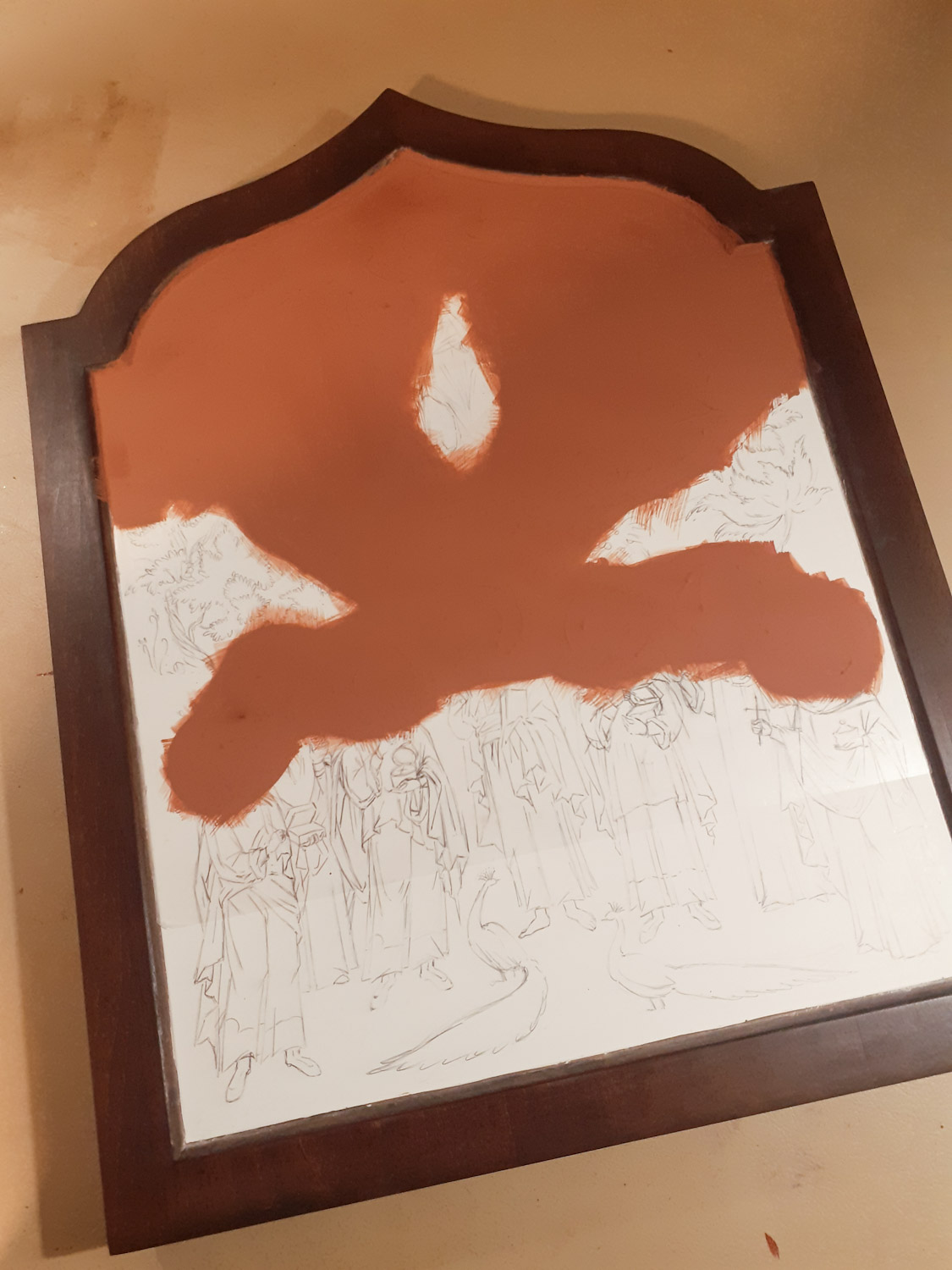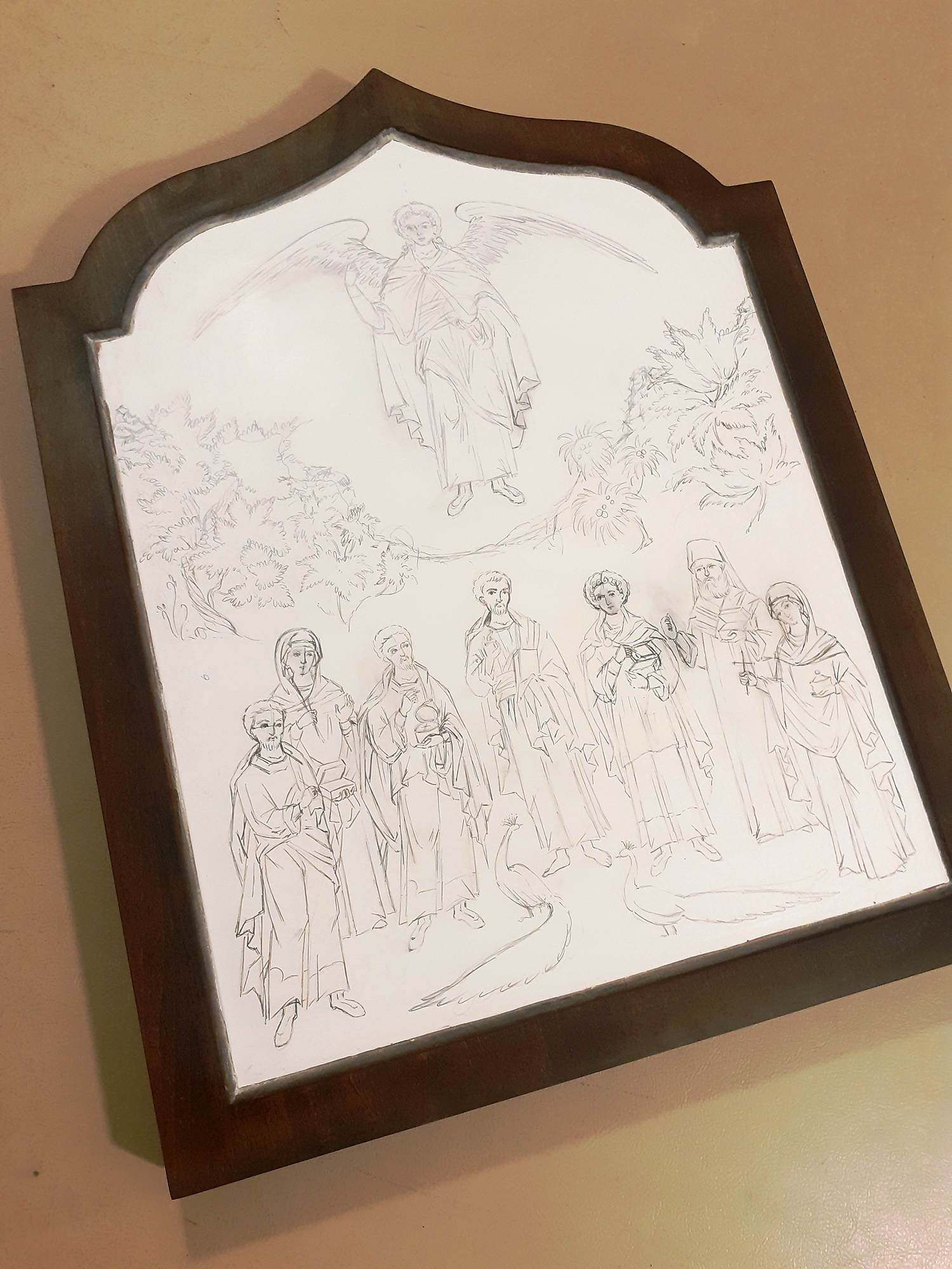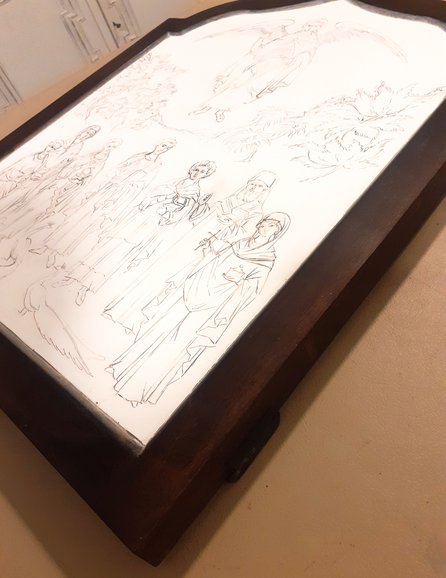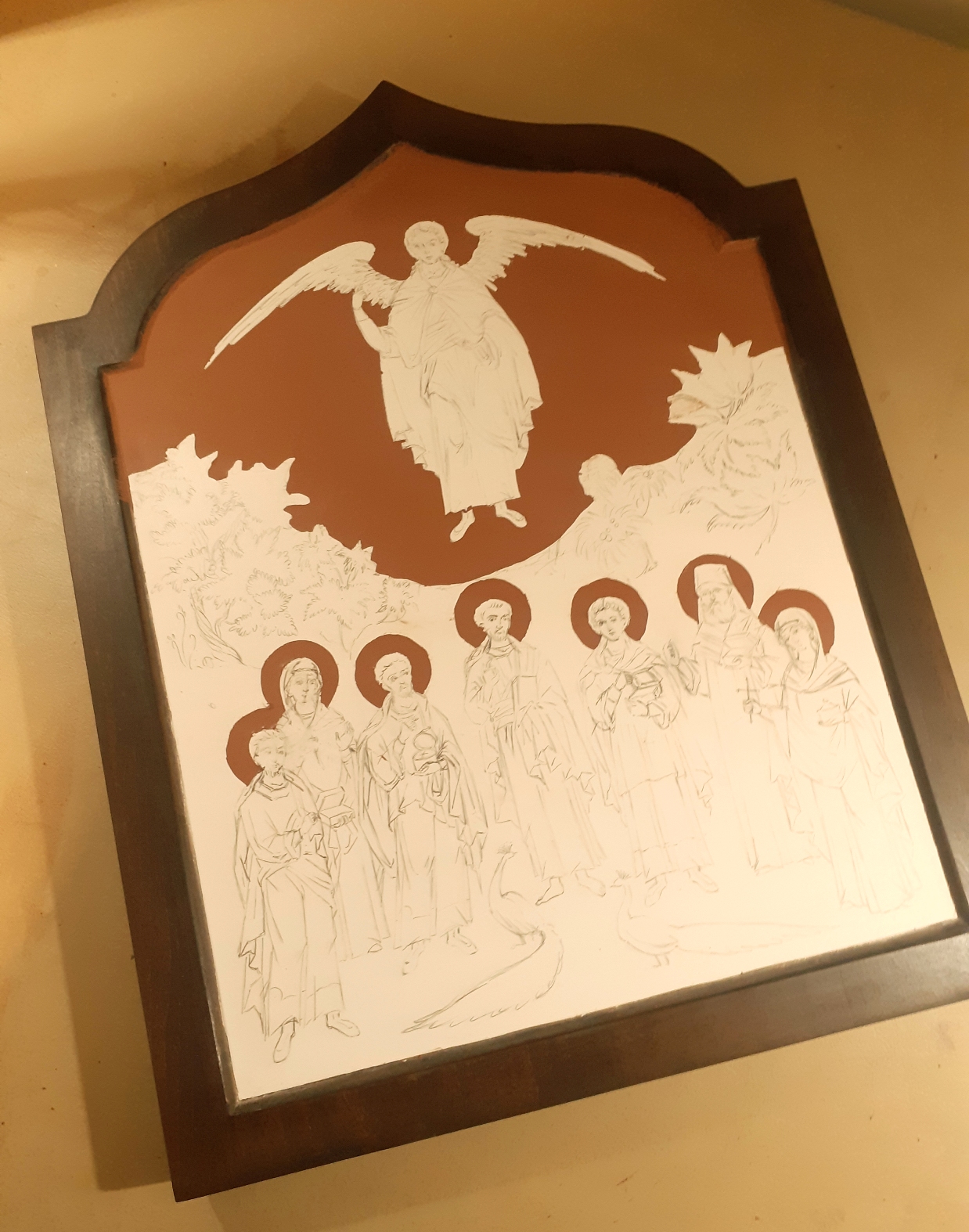 Εδώ φαίνεται το 1ο και το τελευταίο χέρι αμπόλης. Πέρασα συνολικά 35 λεπτές στρώσεις και έχω πετύχει ένα πυκνό, ομοιόμορφο, λείο και ελαστικό υπόστρωμα που είναι απαραίτητο για να δημιουργήσω τα ανάγλυφα σχέδια στο χρυσό. Κάθε στρώση πρέπει να στεγνώσει καλά πριν περάσω την επόμενη αλλά δεν πρέπει να επιταχύνω τη διαδικασία χρησιμοποιώντας θερμότητα γιατί κινδυνεύει να σκάσει και να δημιουργηθούν ρωγμές που θα είναι ορατές στη χρυσή επιφάνεια. Έτσι δουλεύω με υπομονή και αυτή η εργασία χρειάζεται μια ολόκληρη μέρα ξεκινώντας από νωρίς το πρωί και δουλεύοντας μέχρι αργά το βράδυ.