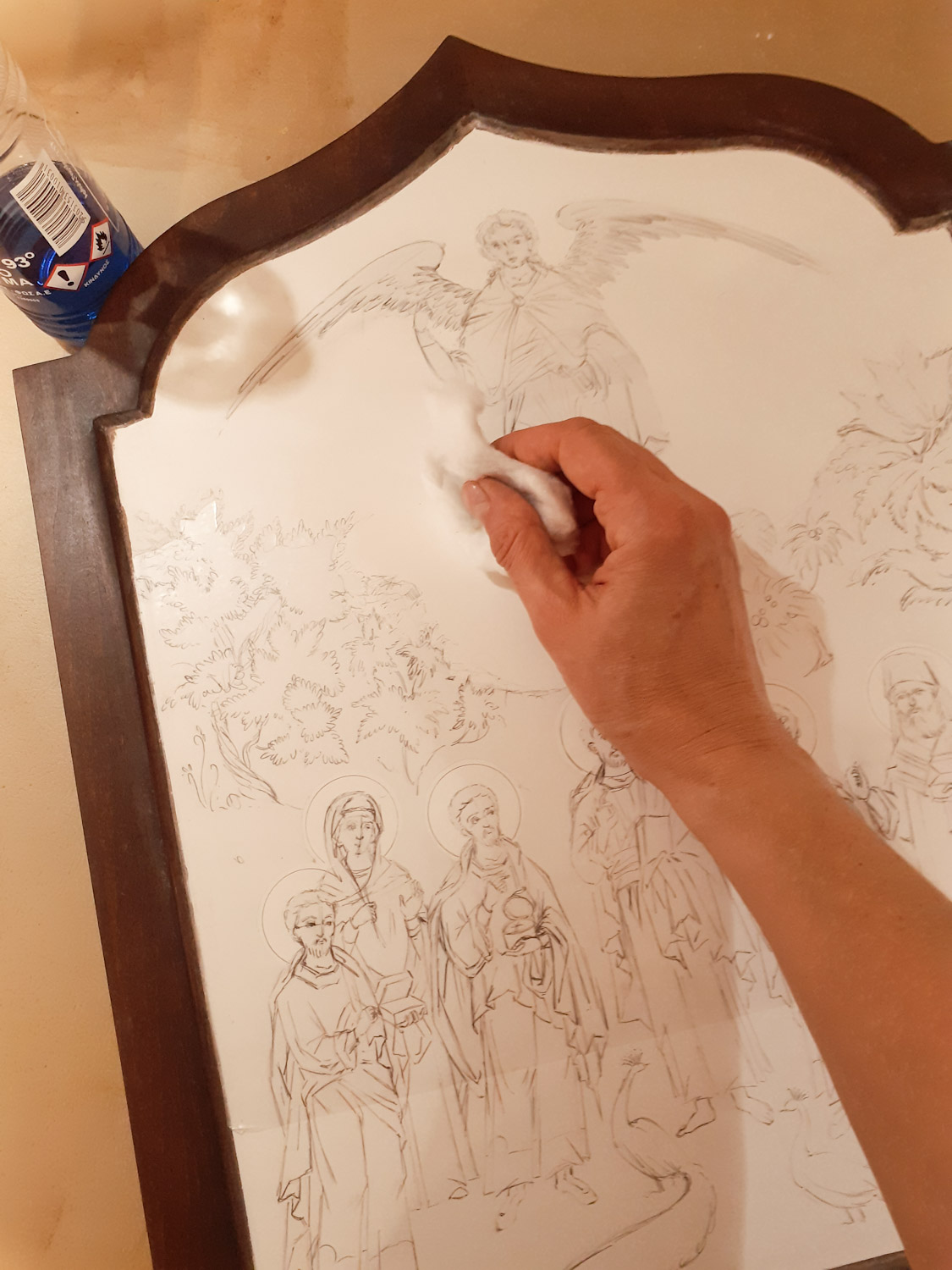 Στη συνέχεια πέρασα απαλά την επιφάνεια που θα χρυσώσω με ένα βαμβάκι βρεγμένο ελαφρά με οινόπνευμα. Η εικόνα τώρα είναι έτοιμη για να αρχίσω να περνάω την αμπόλη Αρμενίας. Η ποιότητα της αμπόλης είναι πολύ σημαντική για το τελικό αποτέλεσμα. Το ίδιο σημαντικές είναι και η αναλογία και η θερμοκρασία της κόλλας.
