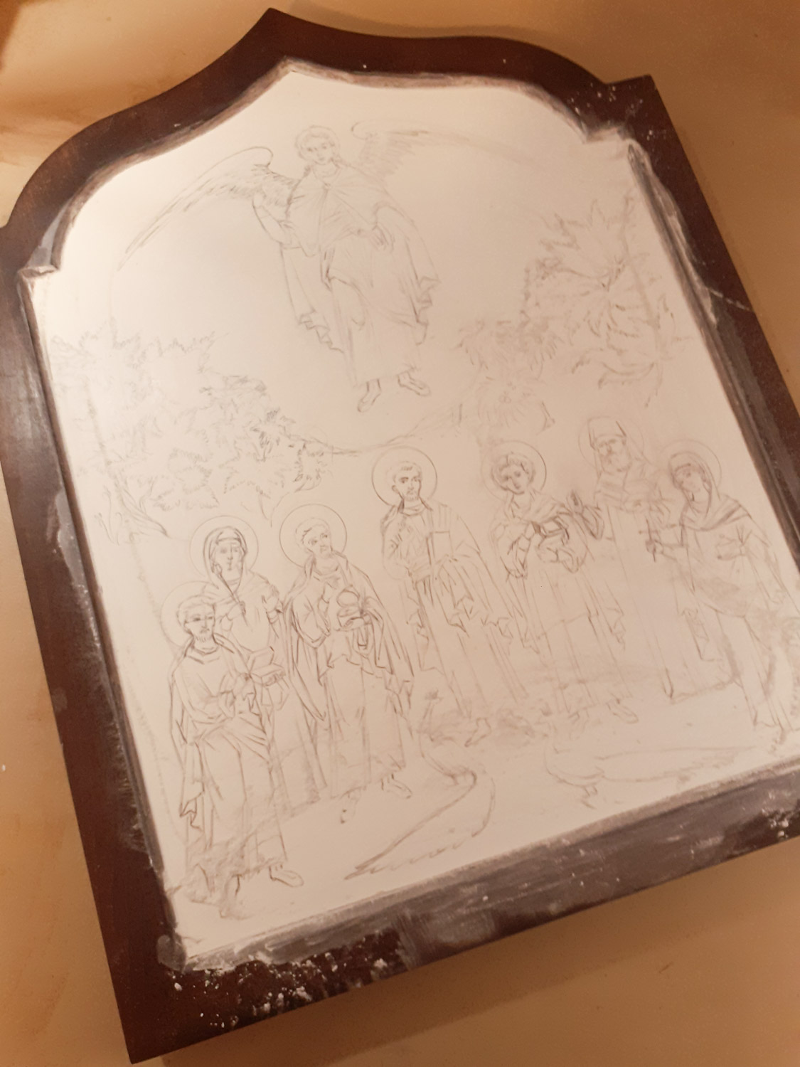 Σε συνέχεια του προηγούμενου άρθρου, και αφού το σχέδιο έχει μεταφερθεί στη ζωγραφική επιφάνεια, δείχνω εδώ μερικά από τα βήματα για το χρύσωμα της εικόνας των Ιατρών Αγίων