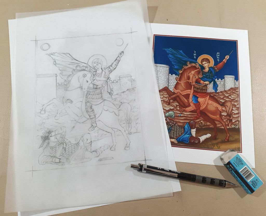 Η πρώτη μου δουλειά είναι να σχεδιάσω ένα ακριβές ανθίβολο στις διαστάσεις του ξύλου μου, για τη μεταφορά του σχεδίου στη ζωγραφική επιφάνεια. Χρησιμοποιώ ένα απλό ριζόχαρτο και μηχανικό μολύβι 0,5 ή 0.3 mm για να μπορέσω να αποδώσω τις μικροσκοπικές λεπτομέρειες στο πρόσωπο και την πανοπλία. Αυτή η εργασία και ειδικά σε τόσο μικρές διαστάσεις δεν επιτρέπει βιασύνες, πρέπει το σχέδιο να αποδοθεί τέλεια. περί της αξίας του ανθιβόλου στην τέχνη της αγιογραφίας αναφέρομαι στο σχετικό άρθρο ΑΝΘΊΒΟΛΟΝ (ANTHIVOLON) – Preliminary drawing