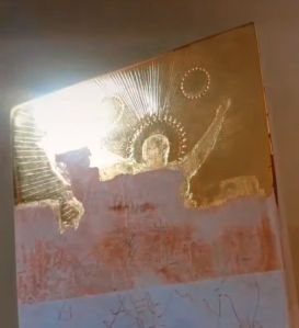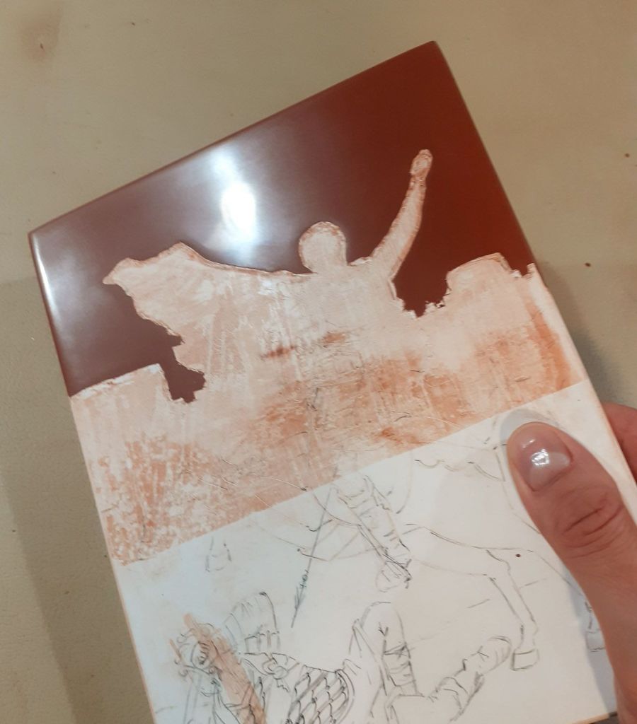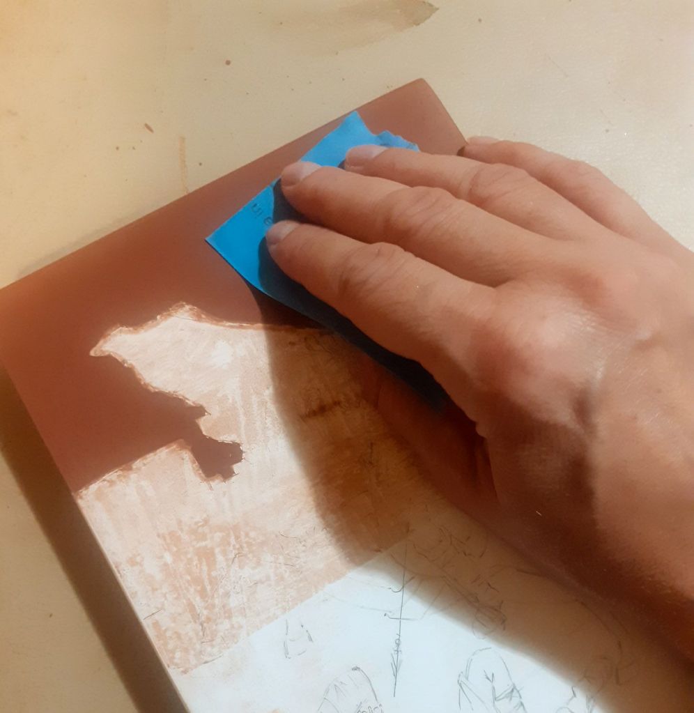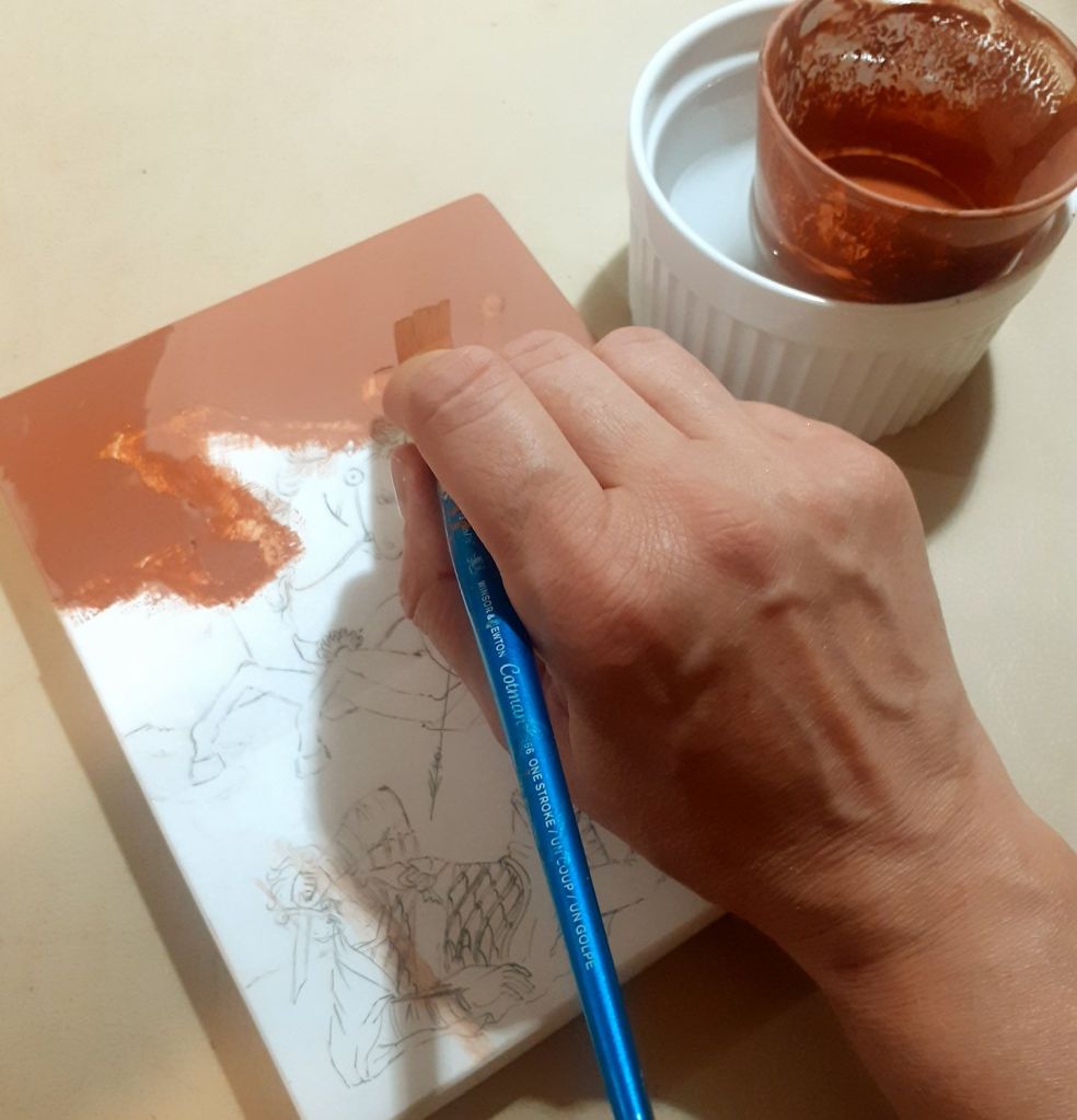 Το επόμενο βήμα της δουλειάς, είναι το χρύσωμα του κάμπου (φόντο) της εικόνας. Χρησιμοποιώ πάντα την αρχαία τεχνική με κόκκινο μπόλο Αρμενίας και ρακή. Περνάω την επιφάνεια που πρόκειται να χρυσωθεί όχι λιγότερες από τριάντα λεπτές στρώσεις μπόλο. Στη συνέχεια τρίβω αμέτρητες φορές με πολύ ψιλά γυαλόχαρτα, μέχρι να έχω μια επιφάνεια απόλυτα λεία και γυαλιστερή, χωρίς καθόλου γραμμές ή σημαδάκια.