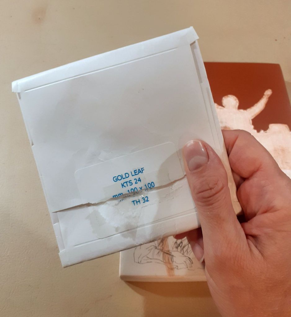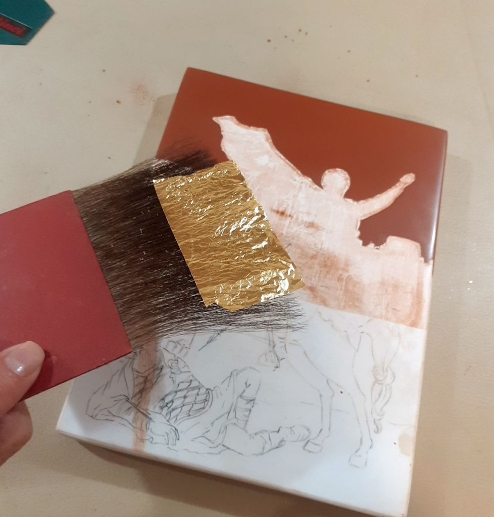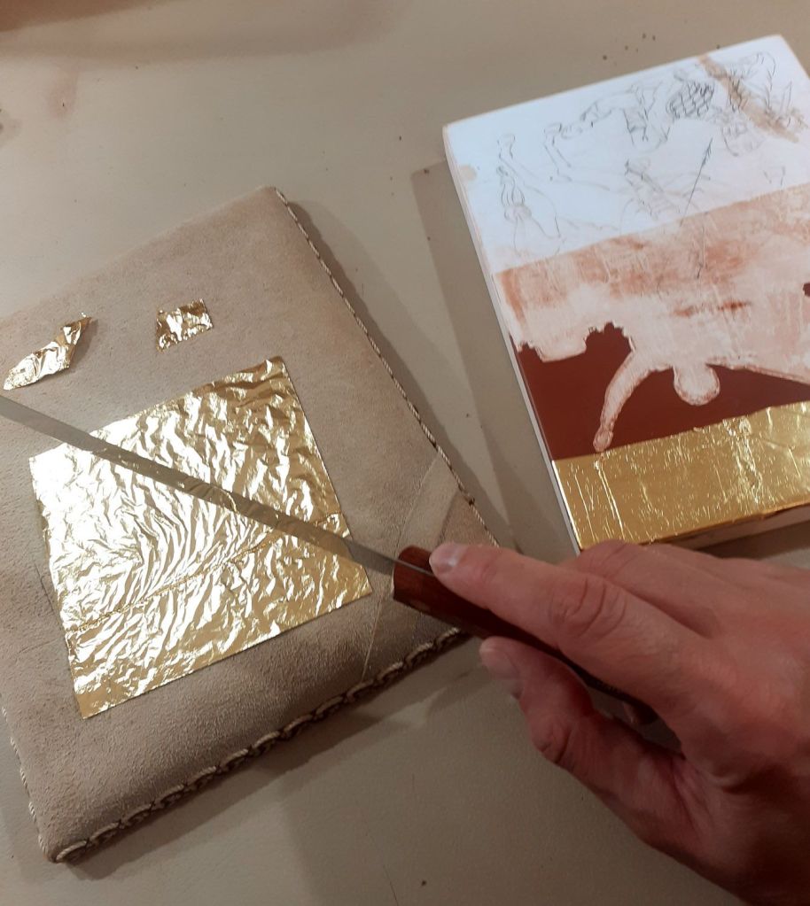 Για να πετύχω το καλύτερο αποτέλεσμα, χρησιμοποιώ αποκλειστικά τον εξαιρετικό χρυσό της Giusto Manetti, 24k και μάλιστα ελεύθερο φύλλο σε πολύ μεγάλο πάχος, το οποίο εισάγω από Ιταλία.