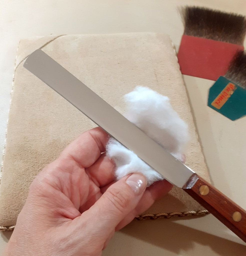 Το μαχαίρι του χρυσωτή κόβει σαν χειρουργικό νυστέρι και απαιτεί μεγάλη προσοχή στον χειρισμό του. Η λάμα καθαρίζεται πάντα πριν τη χρήση με καθαρό οινόπνευμα. Τοποθετώ με προσοχή τα ευαίσθητα φύλλα του χρυσού πάνω σε δερμάτινο μαξιλάρι, τα κόβω στο επιθυμητό μέγεθος, και τα μεταφέρω στην εικόνα με τη φτέρη. Η φτέρη, είναι ένα πολύ απαλό πινέλο από φυσική τρίχα κουναβιού, με το οποίο μπορώ να μεταφέρω τον χρυσό χωρίς να σκίζεται.